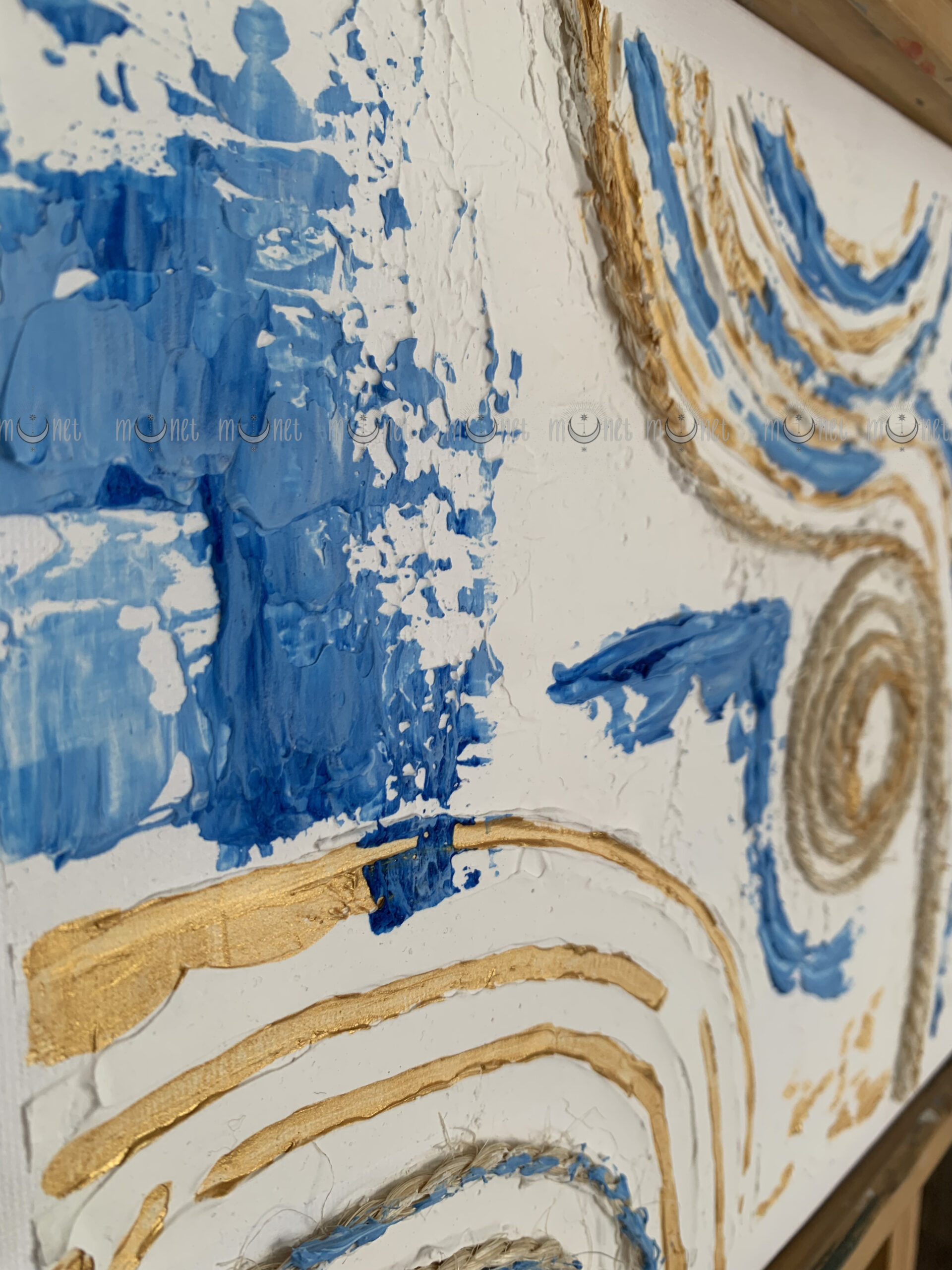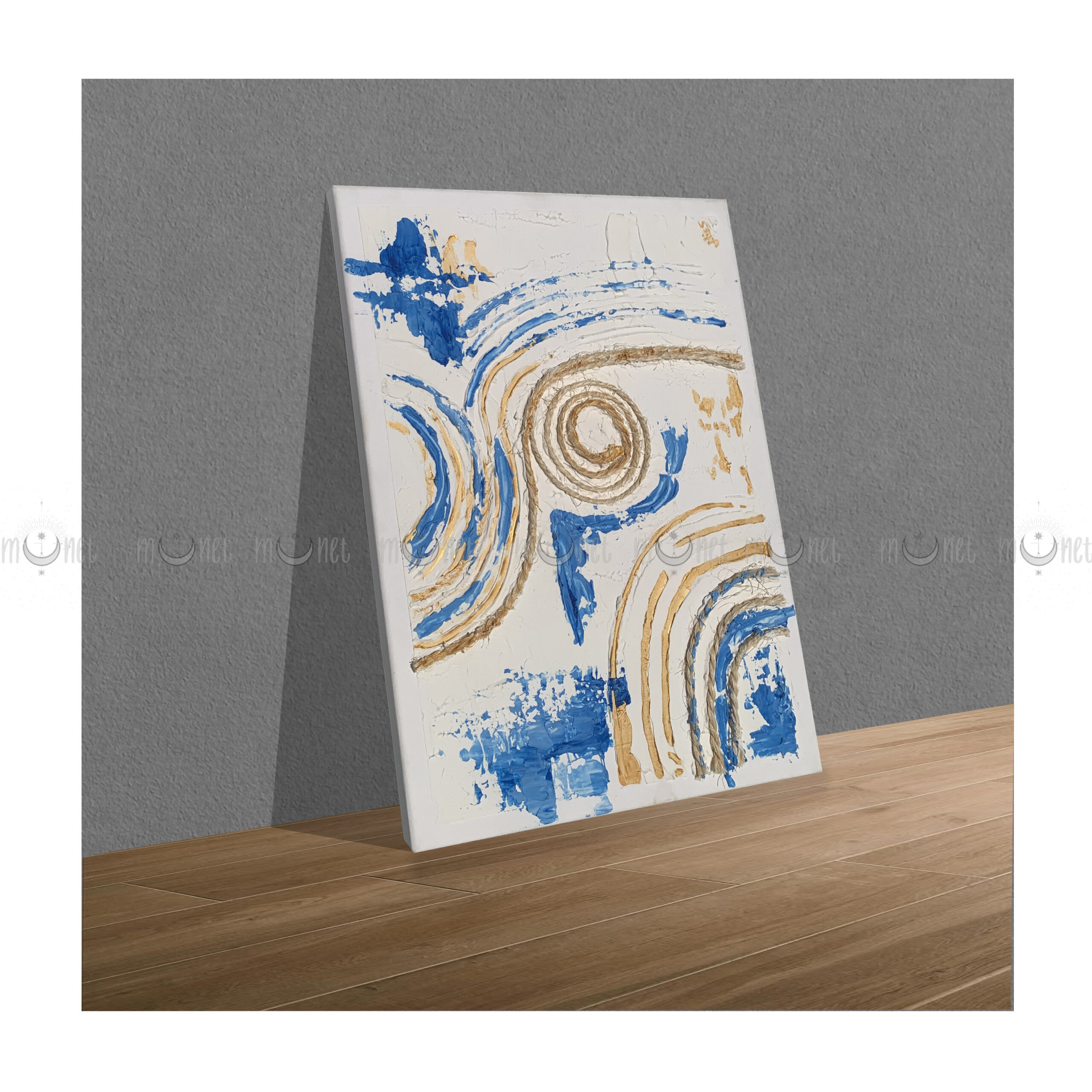 Cuadro abstracto texturizado en tonos azul y arena, con trazos curvos y espirales que evocan el movimiento del viento y el agua.